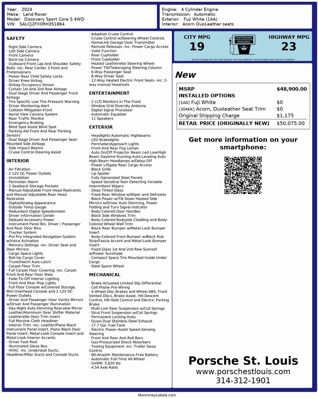 Porsche St. Louis is proud to present this Pre-Owned 2024 Land Rover Discovery Sport Core S 4WD. Finished in elegant Fuji White over Acorn DuoLeather seats, this luxury compact SUV blends refined British styling with confident all-weather capability. Performance: Powered by a turbocharged 2.0L 4-cylinder engine paired with an automatic transmission, this Discovery Sport delivers a balanced combination of efficiency and performance, producing 246 horsepower and 269 lb-ft of torque. The intelligent 4WD system, multi-link rear suspension, and Terrain Response technologies ensure confidence on city streets and off the beaten path alike. Additional Protection: Xpel Essentials - $549 StarGard Theft Recovery System - $995 Discovery Sport Core S 4WD Fuji White Acorn DuoLeather Seats Pivi Pro Integrated Navigation System with Voice Activation Adaptive Cruise Control Blind Spot Assist Rear Traffic Monitor Collision Mitigation-Front Aerial View Camera System Front and Rear Parking Sensors 12-Way Heated Electric Front Seats Heated Leatherette Steering Wheel Memory Settings for Driver Seat and Mirrors HomeLink Garage Door Transmitter Power Liftgate Fixed Glass Sunroof with Power Sunshade LED Headlights with Automatic High Beams Rain Sensing Wipers Trailer Sway Control Automatic Full-Time All-Wheel Drive This 2024 Land Rover Discovery Sport Core S represents a perfect balance of luxury, practicality, and versatile performance, available now at Porsche St. Louis. This vehicle has been fully inspected and is ready for its next owner. Porsche St. Louis, located at 2970 S Hanley Road in St. Louis, Missouri, is your gateway to the world of luxury and high-performance Porsche vehicles. The dealership embodies the essence of Porsche with a commitment to excellence and a deep passion for these iconic sports cars. Porsche St. Louis has the capability to sell and deliver vehicles to customers throughout the United States. As a member of the Indigo Auto Group, Porsche St. Louis embodies the same commitment to excellence and passion for luxury vehicles that define the group as a whole. To get the most accurate and up-to-date information regarding Porsche St. Louis's services and vehicle availability please visit our official website at porschestlouis.com or call us directly at 314-312-1900.