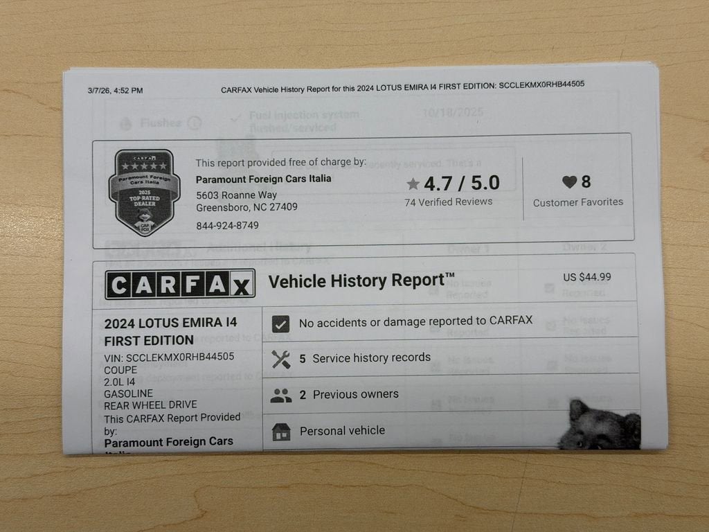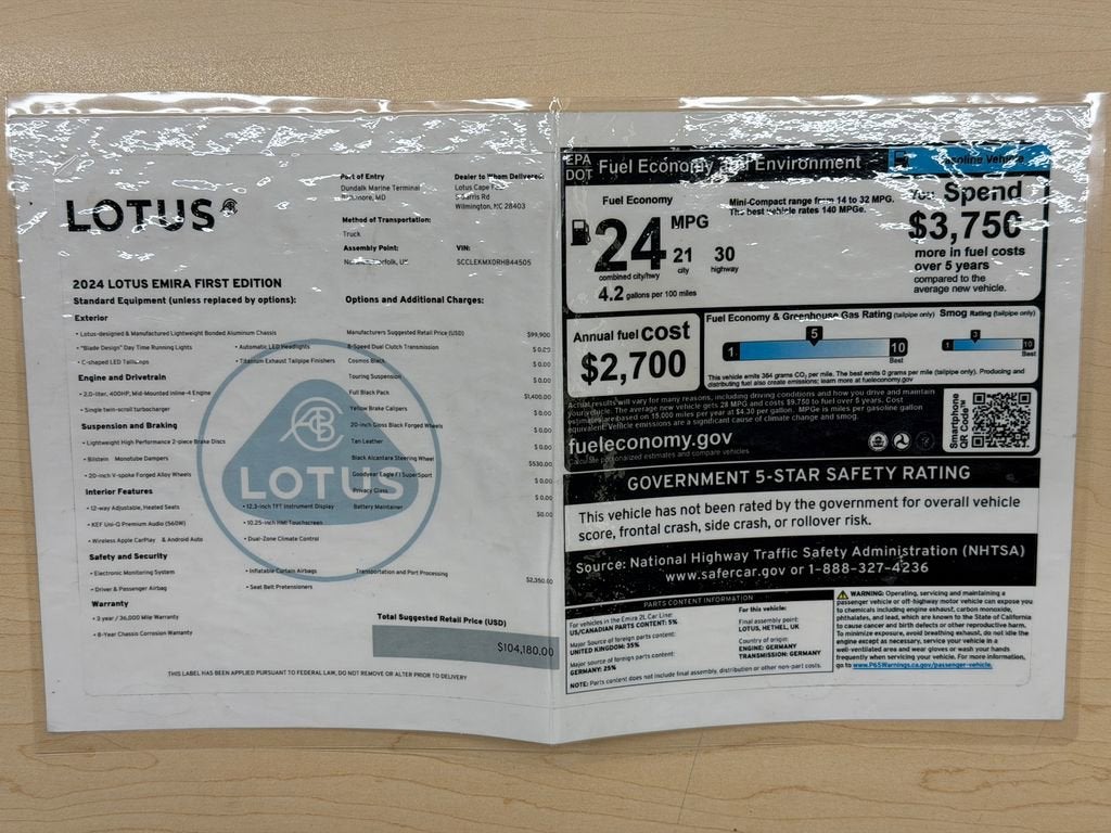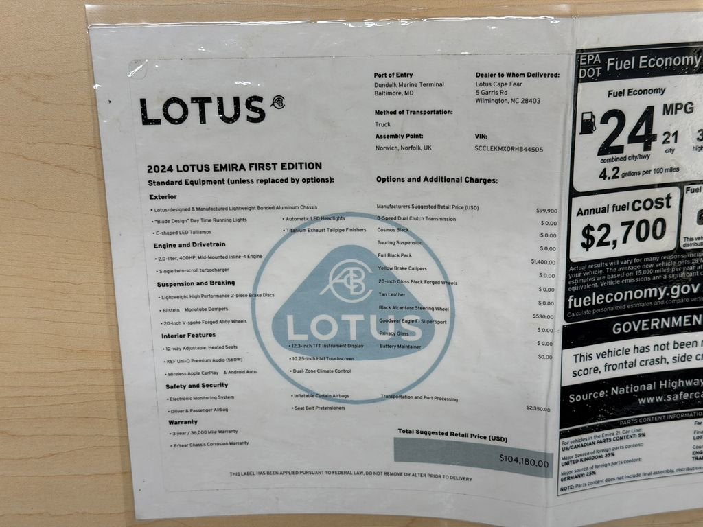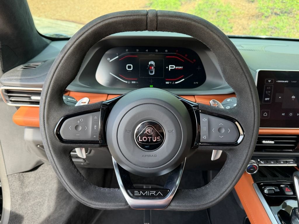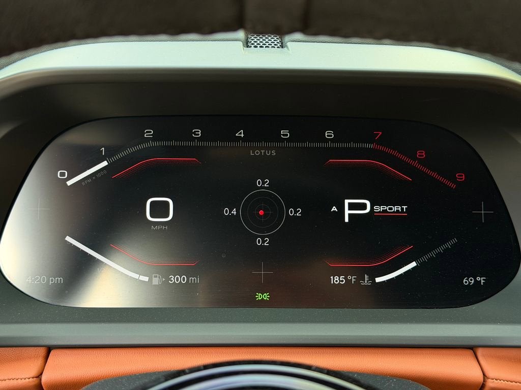 Check out all these great options 10 Speakers, 4-Wheel Disc Brakes, ABS brakes, Air Conditioning, Alloy wheels, AM/FM radio, Auto-dimming door mirrors, Auto-dimming Rear-View mirror, Automatic temperature control, Brake assist, Bumpers: body-color, Driver door bin, Dual front impact airbags, Dual front side impact airbags, Electronic Stability Control, Exterior Parking Camera Rear, Four wheel independent suspension, Front anti-roll bar, Front Bucket Seats, Front Center Armrest, Fully automatic headlights, Garage door transmitter, Heated door mirrors, Heated Front Seats, Heated front seats, Leather steering wheel, Low tire pressure warning, Memory seat, Nappa Leather Seat Trim, Navigation System, Occupant sensing airbag, Outside temperature display, Overhead console, Panic alarm, Passenger door bin, Passenger vanity mirror, Power door mirrors, Power driver seat, Power passenger seat, Power steering, Power windows, Premium audio system: Pioneer, Radio data system, Radio: KEF Premium Branded 10 Channel Audio (560W), Rain sensing wipers, Rear anti-roll bar, Rear window defroster, Remote keyless entry, Security system, Speed control, Spoiler, Sport steering wheel, Steering wheel mounted audio controls, Tachometer, Telescoping steering wheel, Tilt steering wheel, Traction control, Trip computer, and Wheels: 20" Ultra-Lightweight V-Spoke Diamond Cut. 2024 Lotus Emira PLEASE CALL (704)535-7100 TO VERIFY AVAILABILITY SAVE YOUR CASH & ASK ABOUT OUR LOW RATE FINANCING EXTENDED TERMS AVAILABLE TO QUALIFIED CLIENTELE. Clean CARFAX.