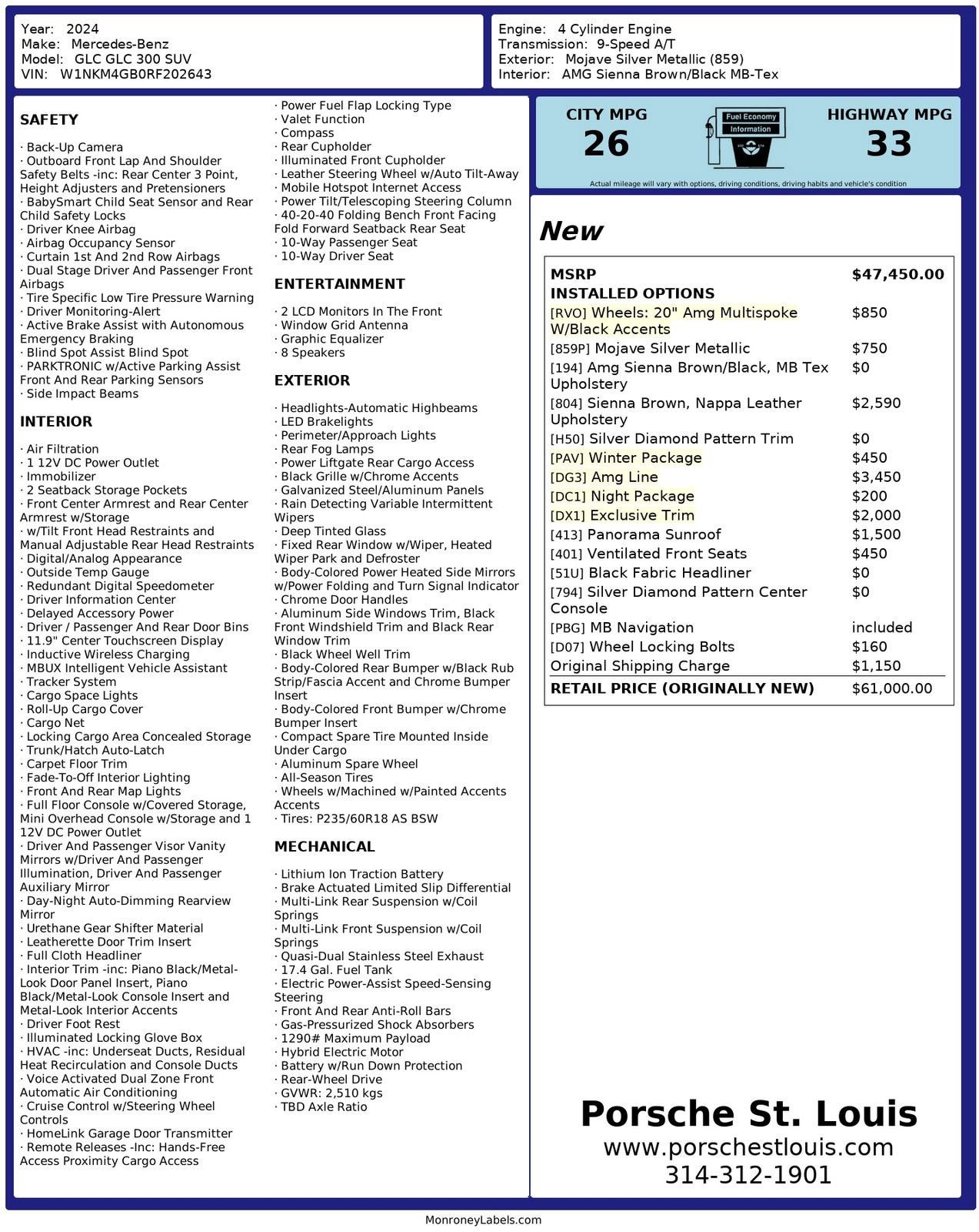 Porsche St. Louis is proud to present this Pre-Owned 2024 Mercedes-Benz GLC 300 SUV. Sporting a sleek Mojave Silver Metallic exterior and a refined AMG Sienna Brown, Nappa Leather Upholstery, this luxury SUV is equipped with the AMG Line Package, enhancing its sporty styling and presence while delivering modern technology and everyday comfort. Performance: Powered by a turbocharged 2.0L inline-4 engine with hybrid assist paired to a 9-speed automatic transmission and rear-wheel drive, this GLC 300 produces 255 horsepower and 295 lb-ft of torque. Its mild-hybrid system enhances efficiency while delivering smooth and responsive performance. Additional Protection: Xpel Essentials - $549 StarGard Theft Recovery System - $995 GLC 300 SUV Sienna Brown, Nappa Leather Upholstery Mojave Silver Metallic AMG Line Night Package Exclusive Trim Panorama Sunroof Ventilated Front Seats Winter Package Silver Diamond Pattern Trim MB Navigation Wireless Charging 11.9" Center Touchscreen Display MBUX Intelligent Vehicle Assistant Apple CarPlay and Android Auto Compatibility Blind Spot Assist Active Brake Assist PARKTRONIC with Active Parking Assist 20" AMG Multispoke Wheels with Black Accents This 2024 Mercedes-Benz GLC 300 offers refined luxury, advanced technology, and everyday usability, available now at Porsche St. Louis. Porsche St. Louis proudly serves clients nationwide. For the most accurate and up-to-date information, please visit porschestlouis.com or call 314-312-1900.